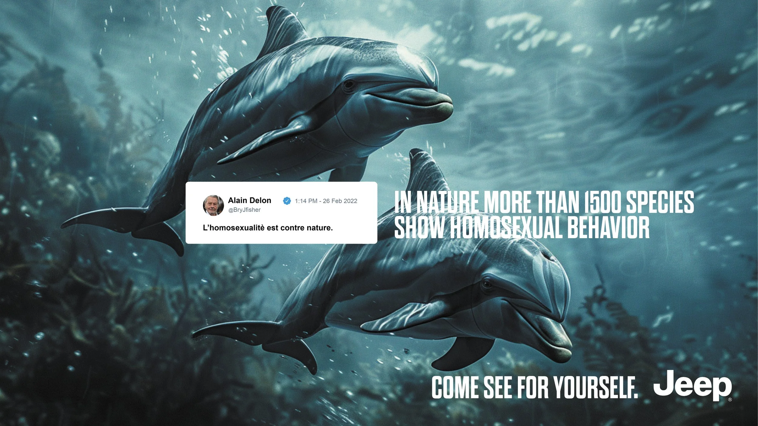 This Jeep ad challenges misconceptions about nature and sexuality by showcasing a well-documented fact: over 1,500 animal species display homosexual behavior. The tagline “Come see for yourself” reinforces the idea that Jeep not only takes you to remote places but also encourages you to challenge preconceived notions, broadening your perspective.
